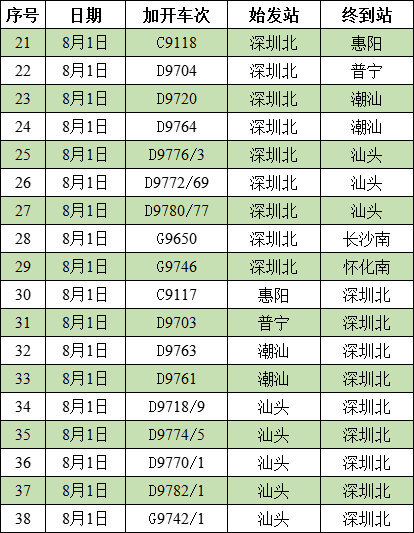 为满足广东、湖南地区旅客出行需求,铁路部门结合12306候补情况科学制定运输方案,决定于7月31日至8月1日采取动车组列车加开、重联、更换长编组等方式提升管内热门区间运能,加开潮汕、长沙等方向的动车组列车38趟。加开的列车信息如下: